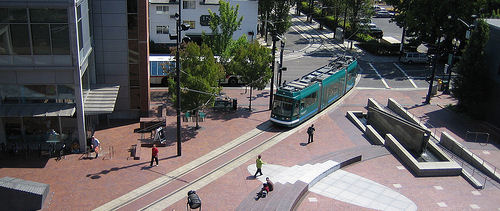 A Streetcar Breezes Through a Downtown Plaza in Portland