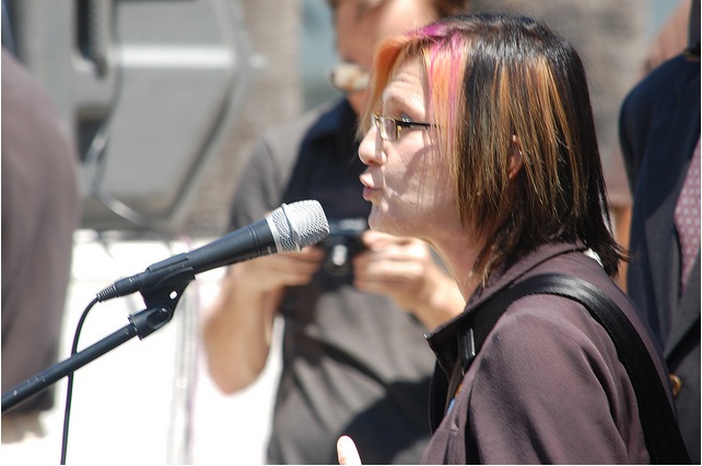 This sign rested at the top of the stairs.Before the event, Joe Linton chatted with reporters from KTLAI like this picture of Alex with some of our local celebrities in the backround,The arrival of one of the victims stood out as emotional high point. Dora didn't say a word but stole the show.I also like this picture of Jenn Klausner. I think everytime here and Thompson speak at the same event we should take pictures.Even blurry, this pic of Ross Hirsch makes him look MAD. He's not a mad guy.Sorry Sammy, not the youngest anymore.