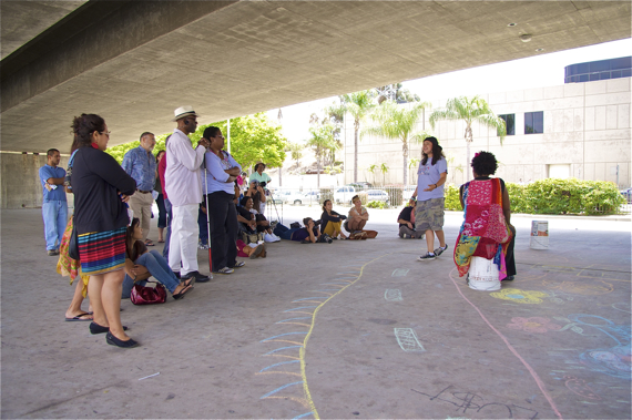 People wandering through the performance space — sited directly under the 105 freeway and across the street from the transfer point between the Blue and Green lines — didn’t always seem that interested in stopping to check it out. Even when WVTC staff and volunteers handed out programs and explained what was going on, only a handful stuck around. Others would move on again after a few minutes.