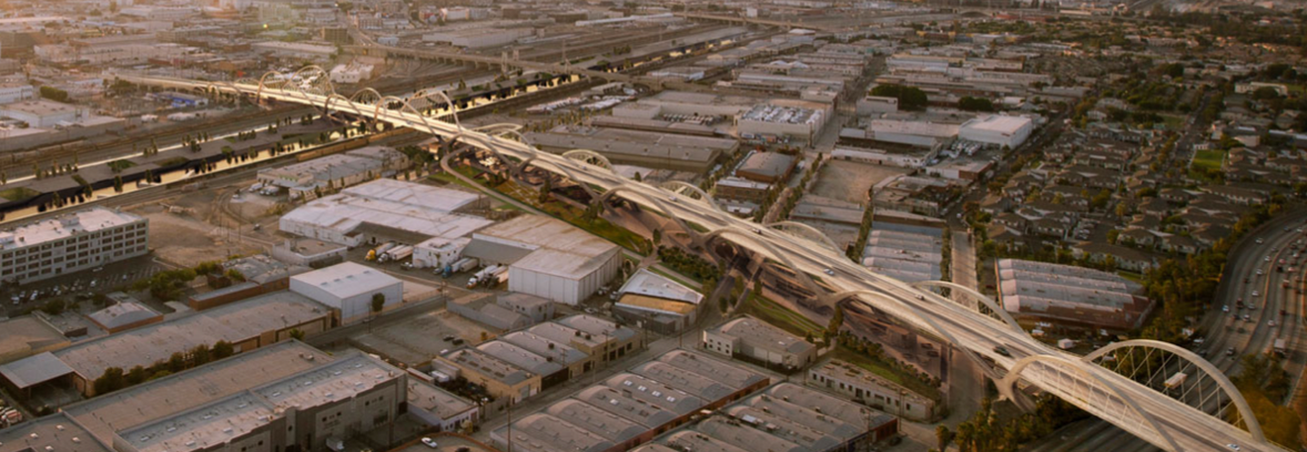 Soaring forty-foot arches book-end a “ribbon of arches” that “weave [two disparate] communities together” via a massive multi-modal structure. Thirty-foot arches run the length of the rest of the 3500 ft. span of bridge, with the exception of two sixty-five-foot arches which will be accessible to pedestrians (one is visible in the top photo, at left) looking to either climb high above the structure or access the businesses and park space (to be created as part of the project) below it.