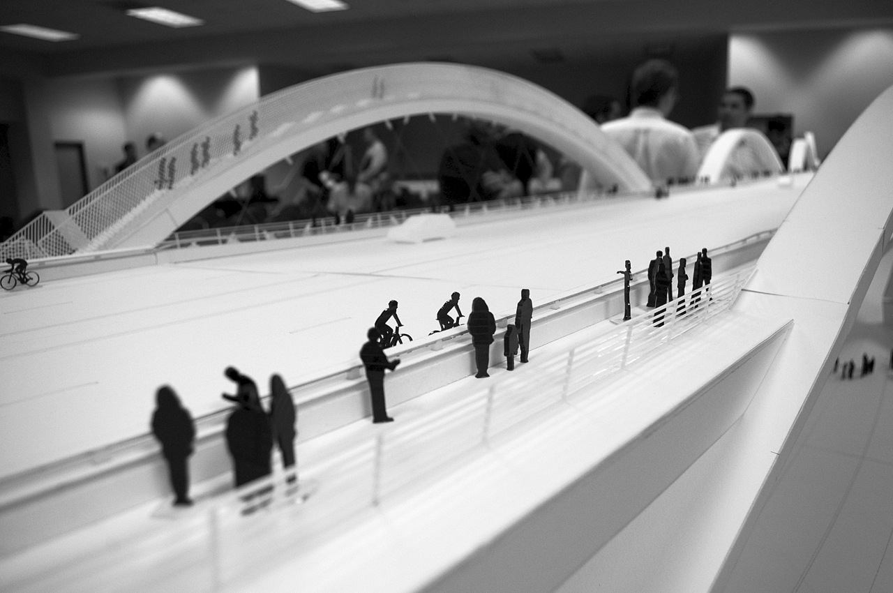 Especially when cyclists featured so prominently into some of the design elements of the bridge, like the spiral ramp (seen below) intended to connect cyclists and pedestrians to the river bed and community below?