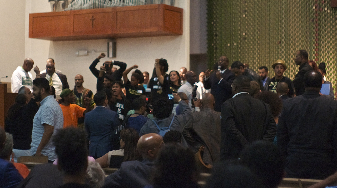 It was a little after 8 p.m., and pleas from an exasperated Reverend Kelvin Sauls that those “interested in having a civil conversation…remain here” had fallen on deaf ears. When members of the Black Lives Matter movement — who had turned their backs on Garcetti and his staff when they spoke, interrupted speakers, chanted “Black Lives, they matter here!,” and finally ascended to the stage to take the mic — began shouting Garcetti down in earnest, dialogue was finally rendered impossible.