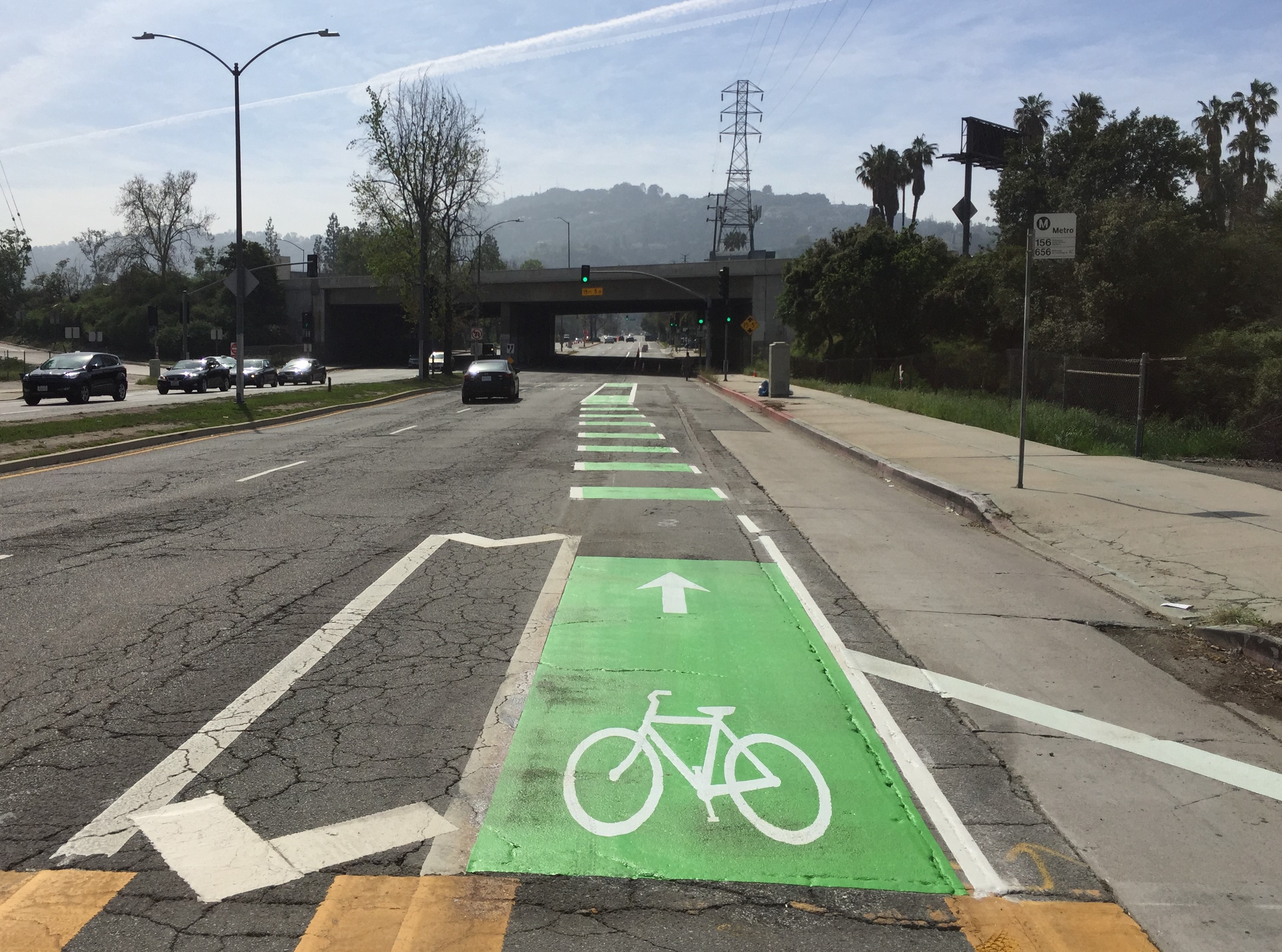 The Vineland Avenue bike lanes got a little greener this week. The L.A. Department of Transportation (LADOT) gave several merge zones a coat of “fresh Kermit.”