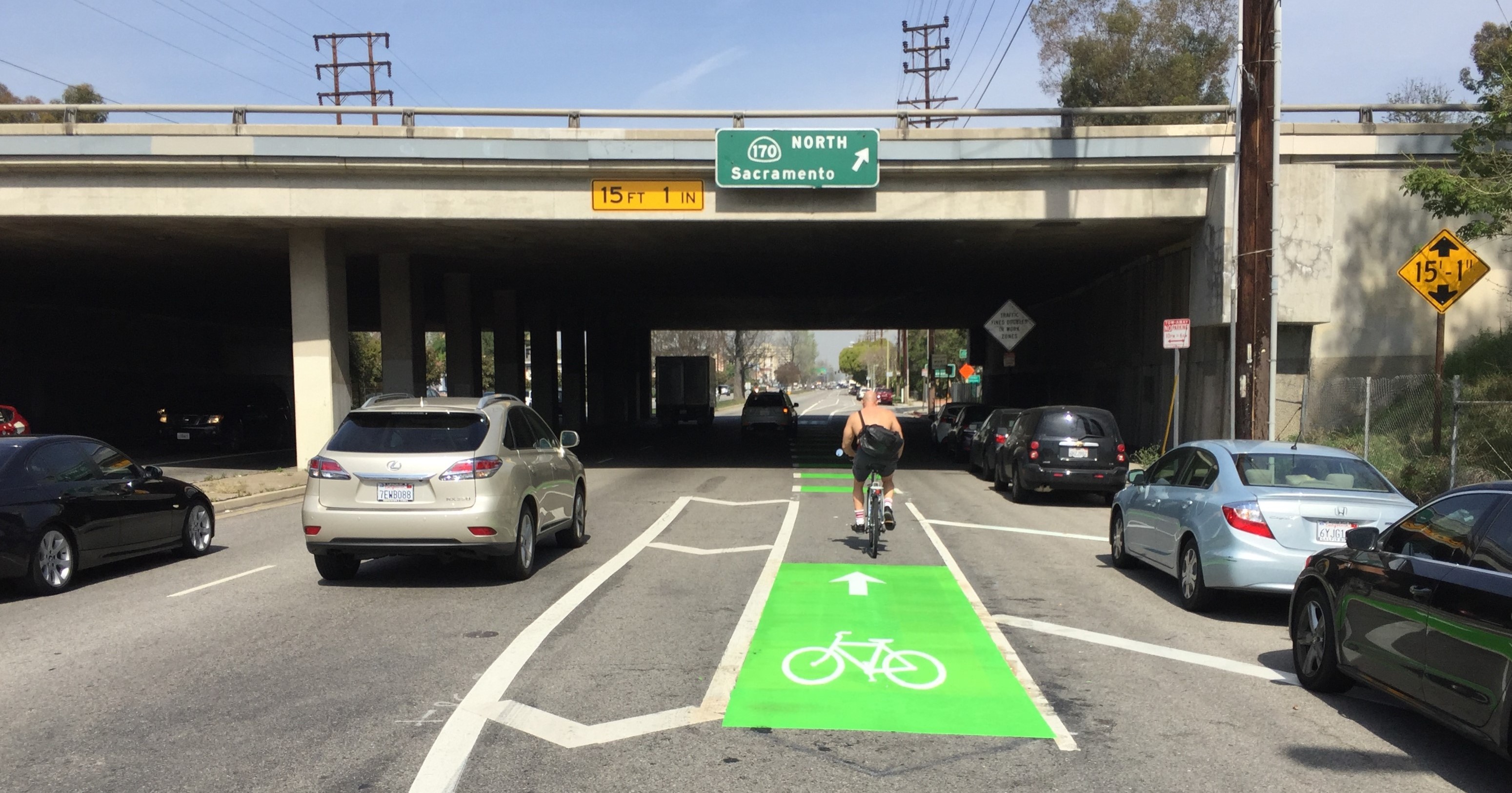 The Vineland Avenue bike lanes run from Ventura Boulevard to Burbank Boulevard in the southeast San Fernando Valley neighborhoods of Studio City, North Hollywood, and Toluca Lake – just east of the North Hollywood Red Line Station. There have been some issues with these lanes in the past, especially in the freeway-infested area where the 101, 134, and 170 Freeways intersect. In a 6-block stretch, between Aqua Vista Street and Hortense Street, the Vineland lanes cross two freeway on-ramps and two freeway off-ramps, with three additional freeway ramps just a block or two away on Moorpark Street and Riverside Drive. Drivers merge into the bike lane and drive in it for blocks before turning; this results in clogging the bike lane, generally at commute hours.