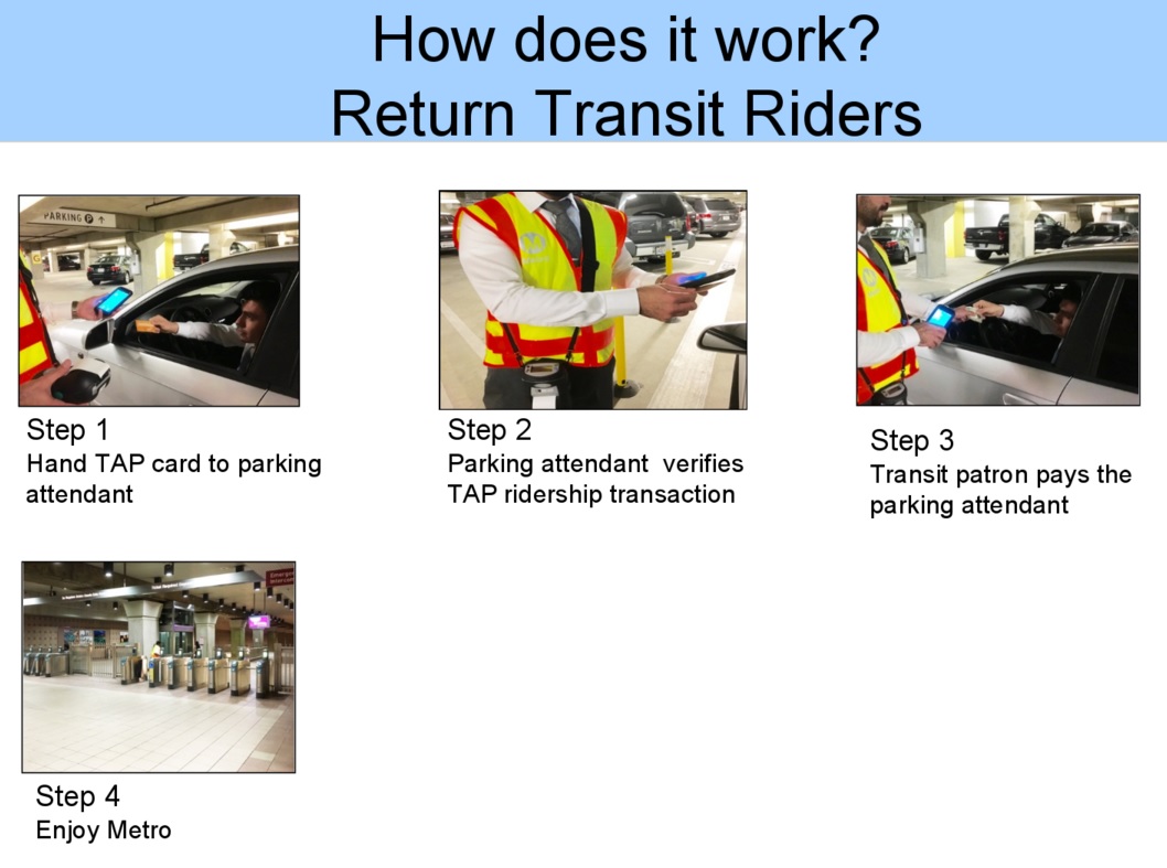 Returning riders will show their TAP card to a parking attendant, who, like Metro security do, will validate that the TAP card has been used in the past few days. The driver will pay the parking attendant or show their paid monthly permit.