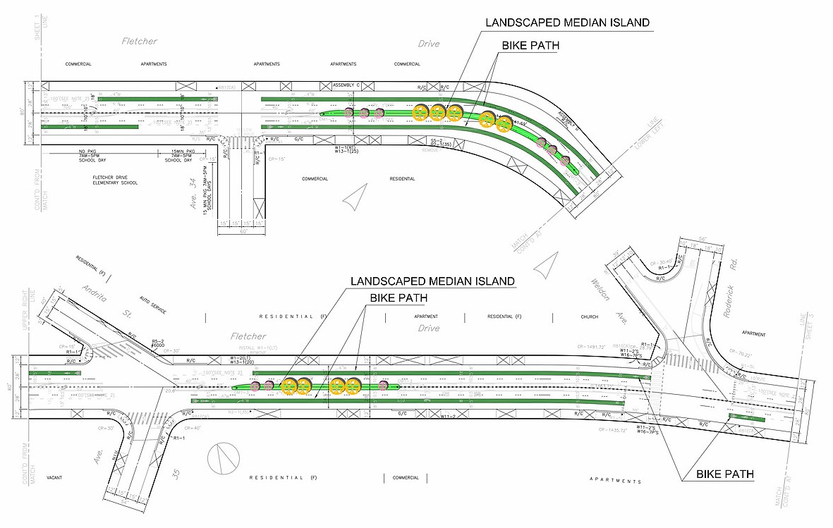 Bike lanes (mislabeled as bike path) and landscape median improvements planned for Fletcher Drive. Source: GPIA