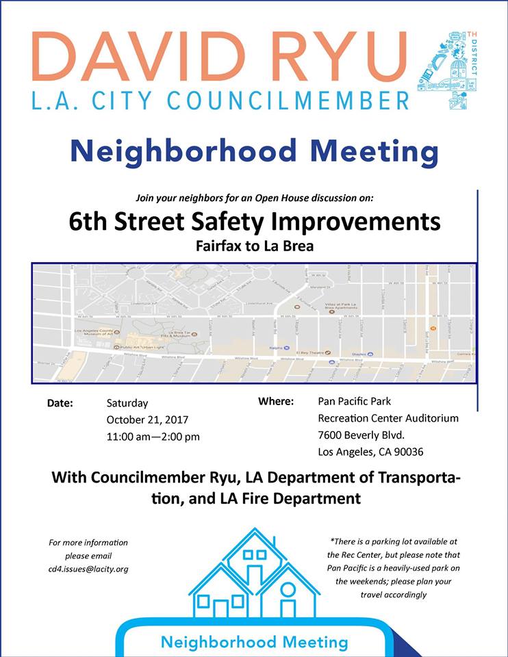 - Saturday 10/21 – Councilmember David Ryu, LAFD, and LADOT host a community meeting on 6th Street Safety Improvements from La Brea to Fairfax. The meeting takes place from 11 a.m. to 2 p.m. at Pan Pacific Park Auditorium at 7600 Beverly Boulevard in Mid-City. Details at event flier or Facebook event.