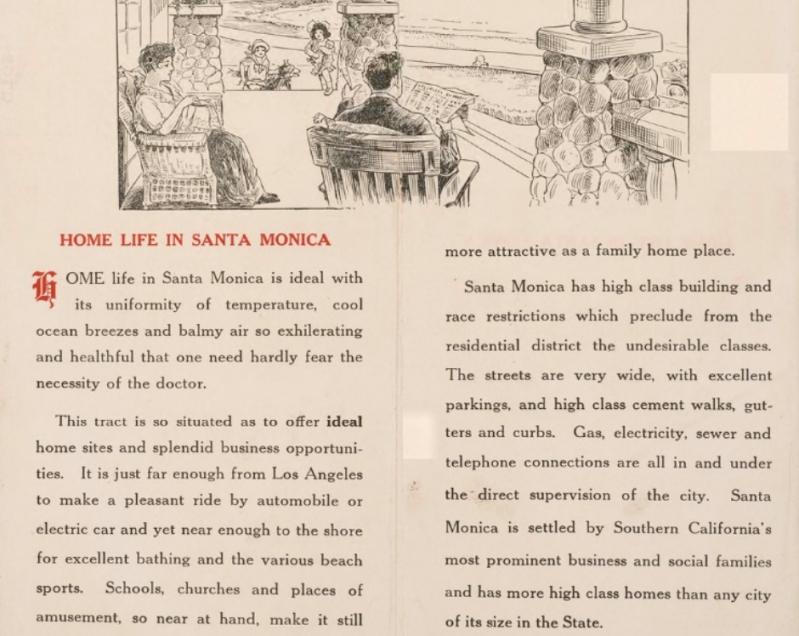 The Santa Monica of today is effectively the same as in the early years of the 20th century, that’s when the advertisement for a new housing development was printed and bragged of the city’s “race restrictions which preclude from the residential district the undesirable classes.”