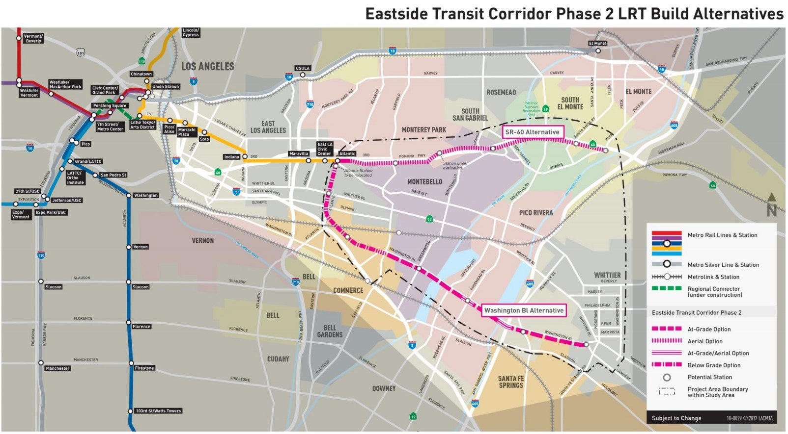 - The Washington Boulevard alternative goes through unincorporated East L.A., the cities of Montebello, Commerce, Pico Rivera, and Santa Fe Springs to a terminus in Whittier. This alignment includes a nearly 3-mile subway tunnel below Atlantic Boulevard from 3rd Street to Washington, then rail along Washington mostly at-grade, though with some aerial portions. This alignment serves relatively population-dense, low-income, predominantly Latinx communities.
