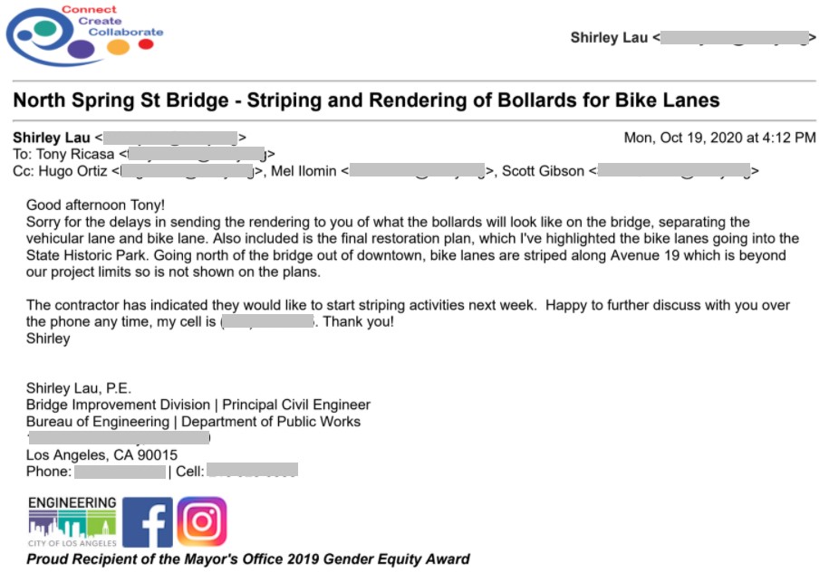 In an email to Streetsblog, BOE spokesperson Mary Nemick stated that “all striping on Spring will start after North Spring Street Widening and Rehab Phase II is completed” and “phase II is scheduled to be completed soon.” Per BOE’s latest Project Information Report, phase II is now anticipated to be completed June 30, 2021.