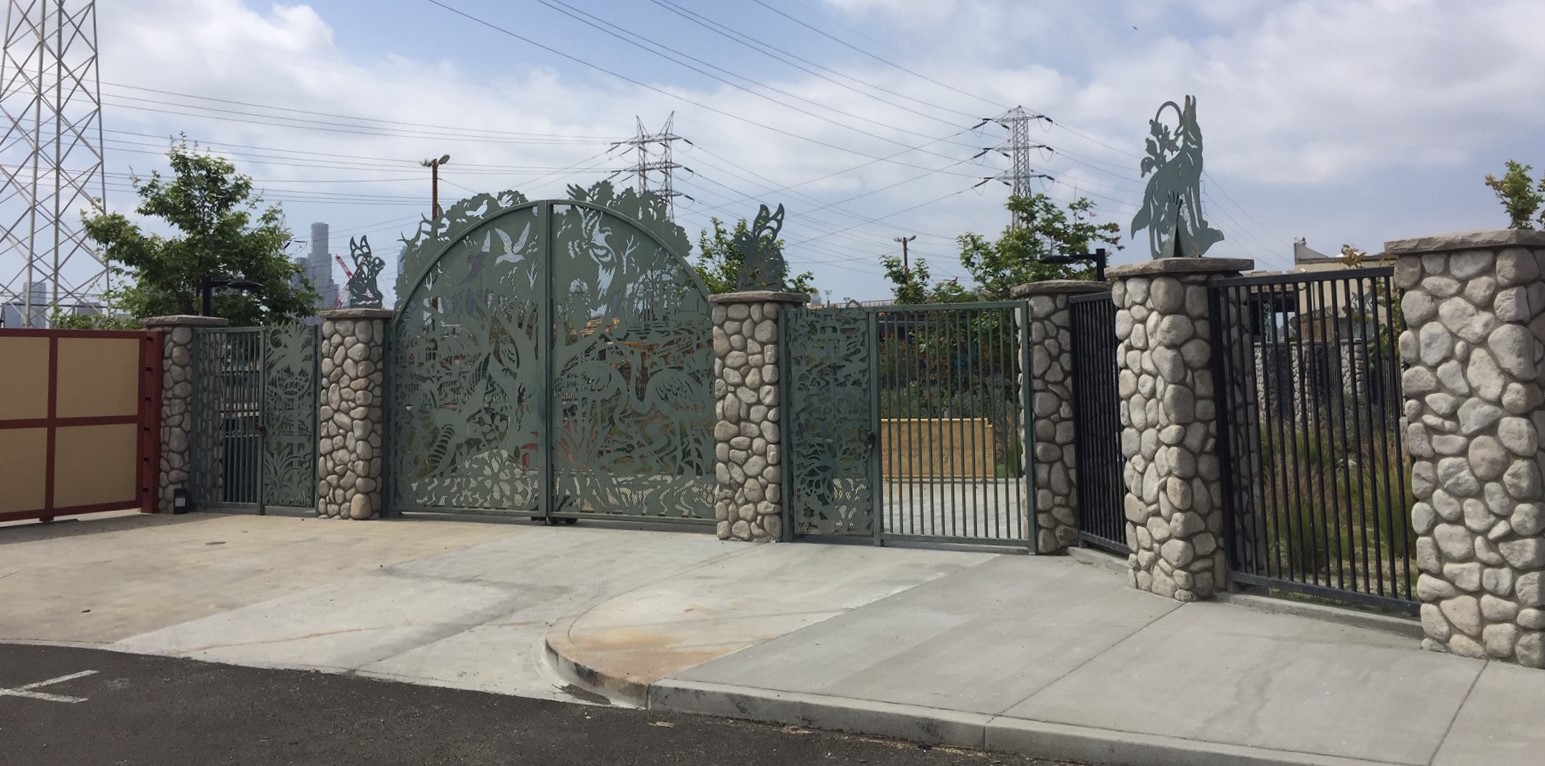 Just east of the coming roundabout, the city has already completed its Jesse Street Air Treatment Facility (ATF), which cleanses air from a city sewer deep underground. The ATF includes a small fenced green space that borders the train tracks along the L.A. River. The pocket park was included in the ATF project as an early component of the city’s plans to revitalize the river, though today it is off-limits to the public, and, like most surfaces in this vicinity, heavily tagged.