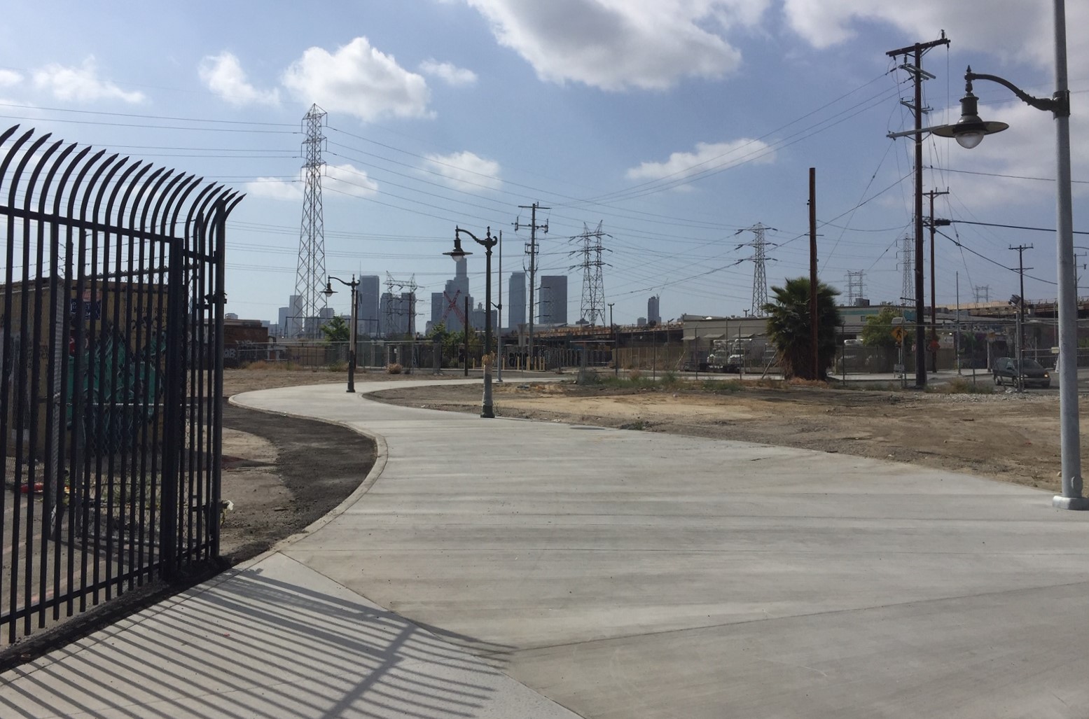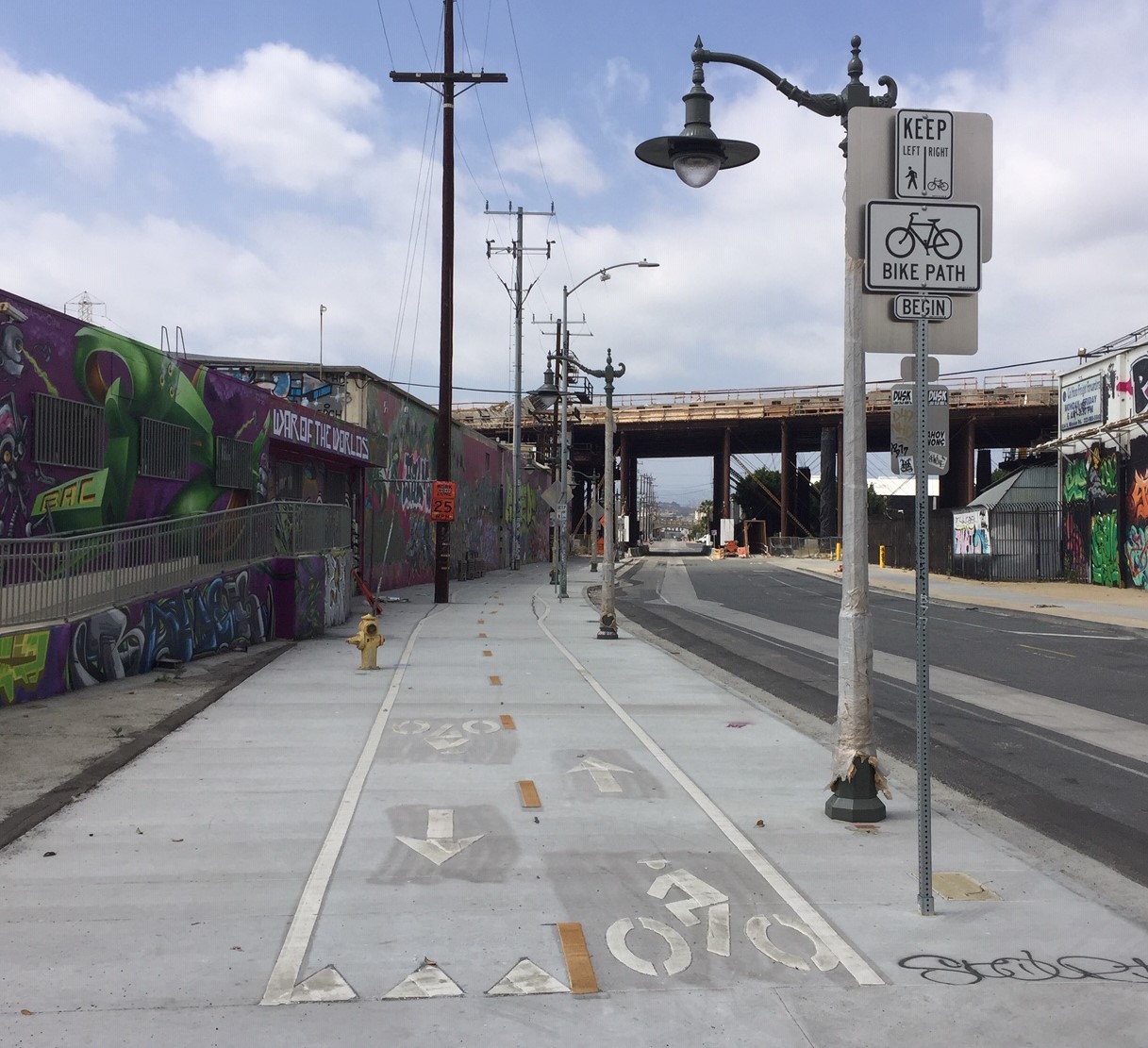 The new paths feel out of place with their older surroundings. In such an industrial area, with such short segments unconnected to a bikeway network, the new paths serve few cyclists today. With construction of the new viaduct and park below it – and the area’s gentrification driving more changes including some conversion of industrial spaces to loft housing, these paths will serve new destinations in the future. The question is whether they will be able to get current Boyle Heights residents to their new park.