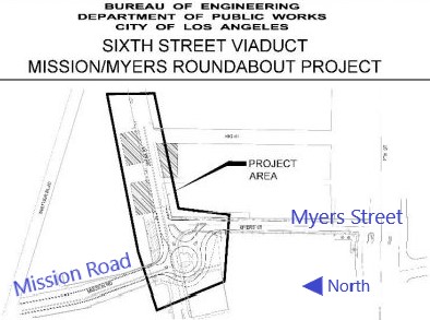 In between the two paths – at the intersection of Myers, Mission, and Jesse – the city will construct a new traffic circle replacing two T-intersections. The street level improvements had been part of the viaduct replacement mega-project, but were split off. The bike and pedestrian improvements were funded under the initial round of state Active Transportation Program (ATP) grants (see project list). The roundabout was funded via Metro ExpressLanes Active Transportation project funding (see the Round 2 project list).