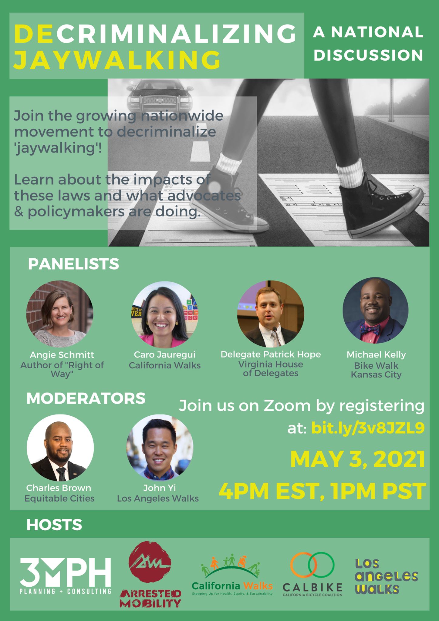 - Monday 5/3 – Today starting at 1 p.m., walk advocacy groups will host a free webinar on Decriminalizing Jaywalking: A National Discussion. Panelists include Angie Schmitt, formerly of SBUSA and author of Right of Way; Caro Jauregui, California Walks; Charles Brown, Equitable Cities; Patrick Hope, Virginia House of Delegates; John Yi, Los Angeles Walks; and Michael Kelly, Bike Walk Kansas City. Sign-up via Zoom pre-registration.