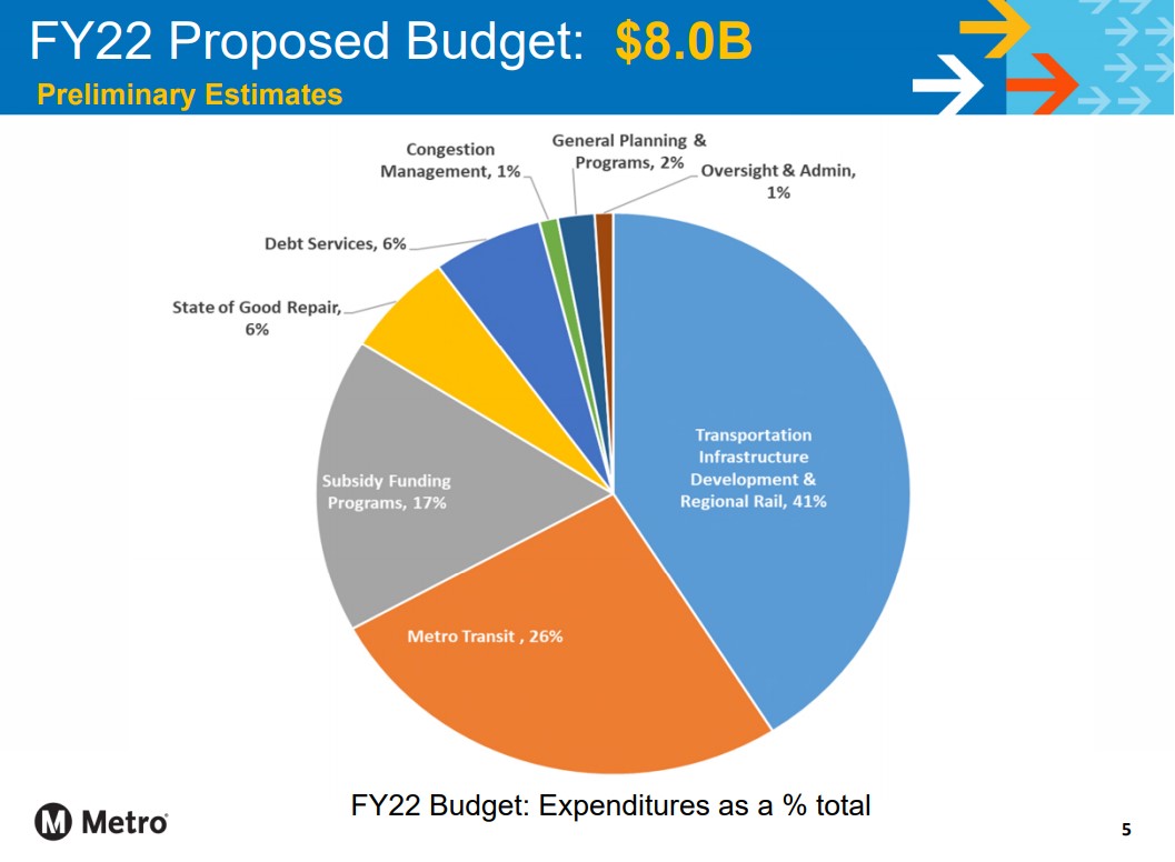 It’s budget season for Southern California agencies. Today Streetsblog takes a look into Metro’s proposed $8 billion budget for Fiscal Year 2022, which will begin June 1, 2021. Metro is seeking public input on the FY22 budget. The board will discuss and vote on the budget in its Finance Committee meeting (and concurrent Budget Public Hearing) next Wednesday and at the full board meeting on May 27.