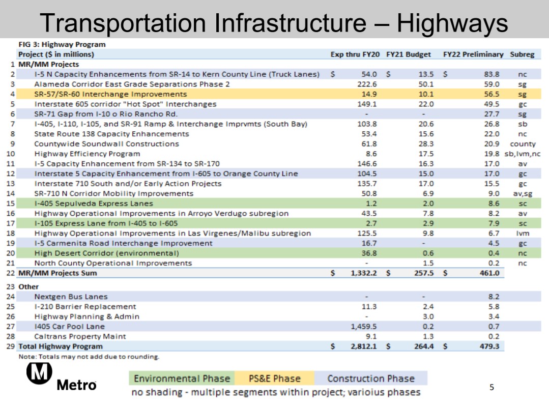 Transit construction continues on the half-dozen new rail lines that many Streetsblog readers are familiar with. Construction should be wrapping up on the Regional Connector and Crenshaw/LAX lines, with testing getting underway for openings expected in early FY23. Construction will also get underway on two new transit projects: the LAX Connector and East San Fernando Valley light rail.