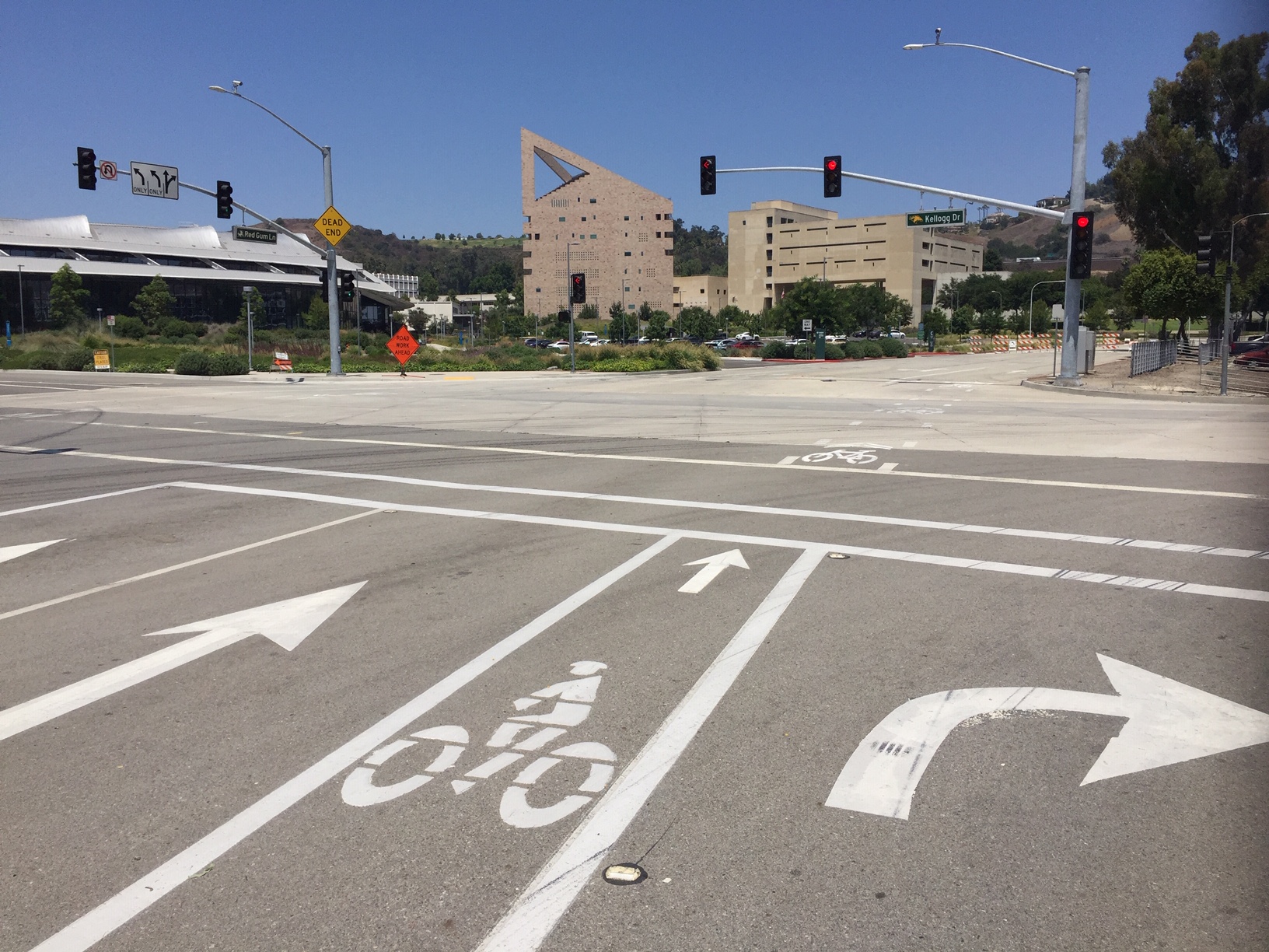Recently, protection was added to the southwest side bike lane on Kellogg Drive at Cal Poly Pomona, from Campus Drive to Eucalyptus Lane.