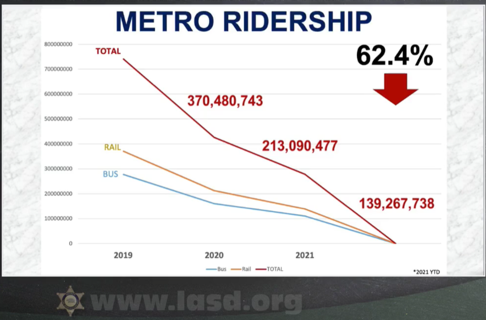 “If there’s no safety… people don’t ride the subways, the trains, buses – and it shows,” Villanueva stated, sharing a ridership graph that bore little relation to Metro’s own ridership numbers.