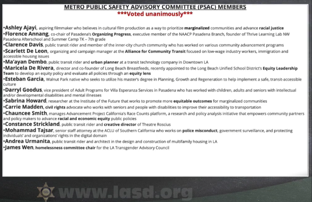 Last Wednesday, Sheriff Villanueva hosted a press conference [watch via Facebook] where he spoke against the PSAC as “the definition of a woke advisory group” and warned of dire consequences if Metro doesn’t continue and expand its current transit system policing. Villanueva characterized the PSAC (advisory) vote as a proposal for “abolishing all three policing contracts” including zeroing out LASD personnel.