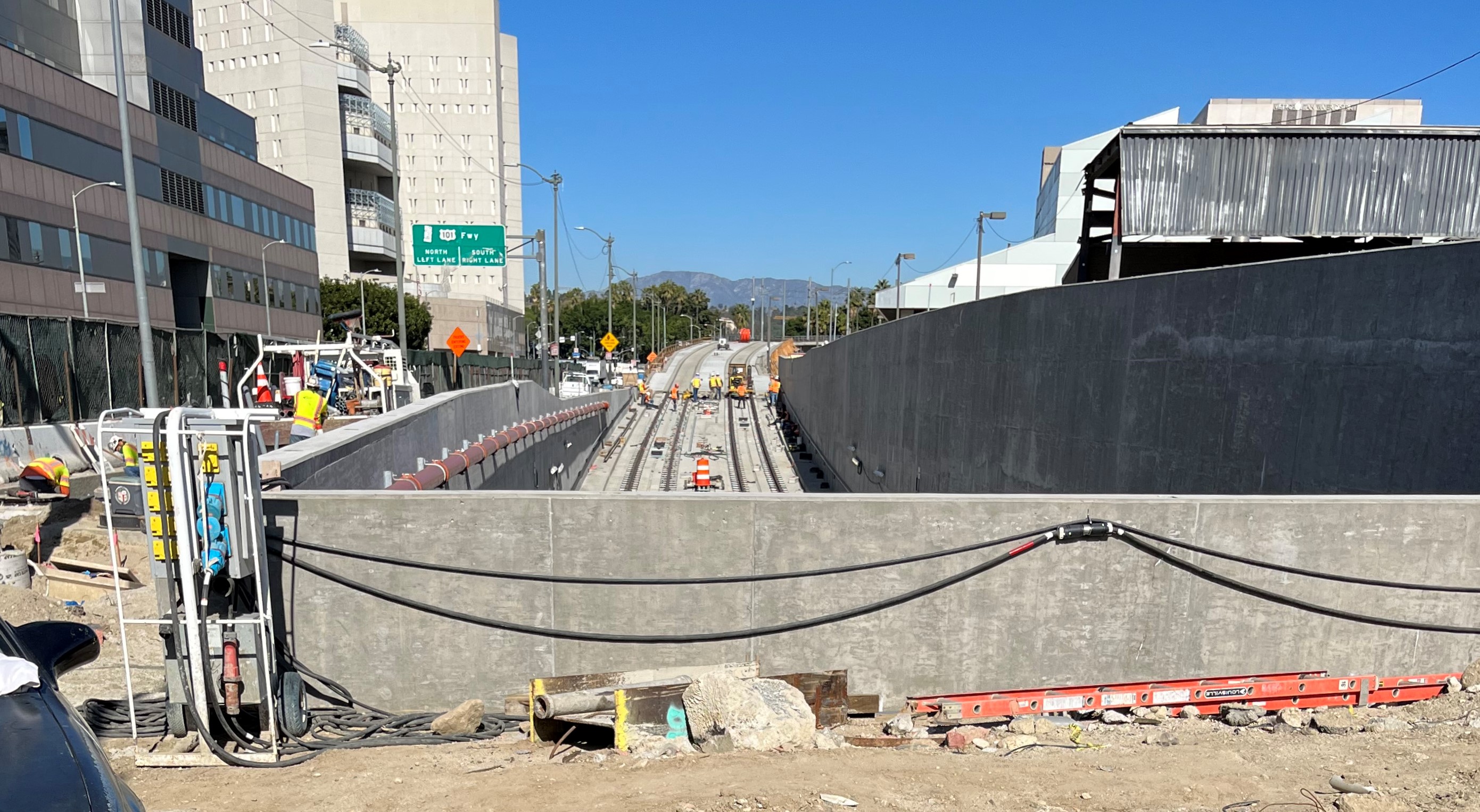 The Regional Connector is a $1.8 billion 1.9-mile light rail subway below downtown Los Angeles. Construction got underway in 2014, and is now 88 percent complete. If all goes well, the line will be substantially complete by mid-2022. After that it will undergo about a half-year of testing, then will open to the public. The grand opening is about a year away – likely at the very end of 2022 or early 2023.