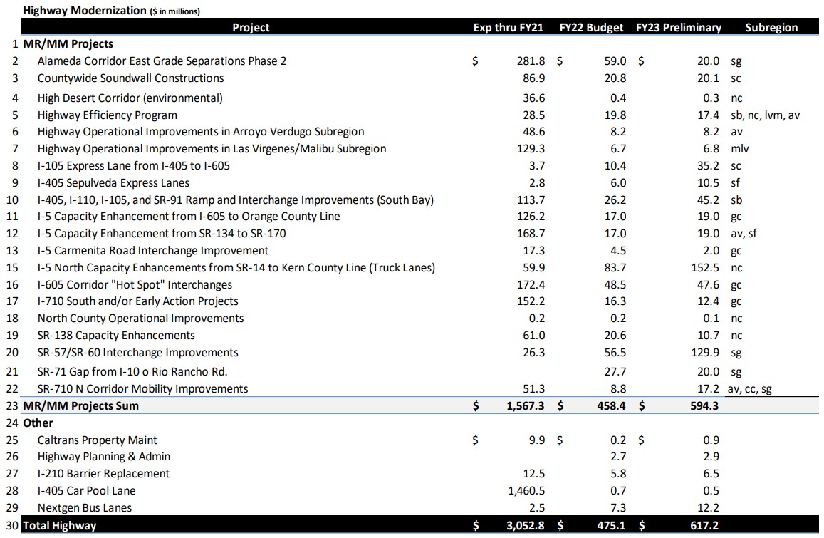 Indeed Metro’s $679 million North County 5 Freeway widening accounts for a quarter of the proposed FY22-23 Highway Expansion budget: $152 million out of $617 million. That project is under construction (and partially state- and federally-funded), so its budget allocation won’t change significantly.