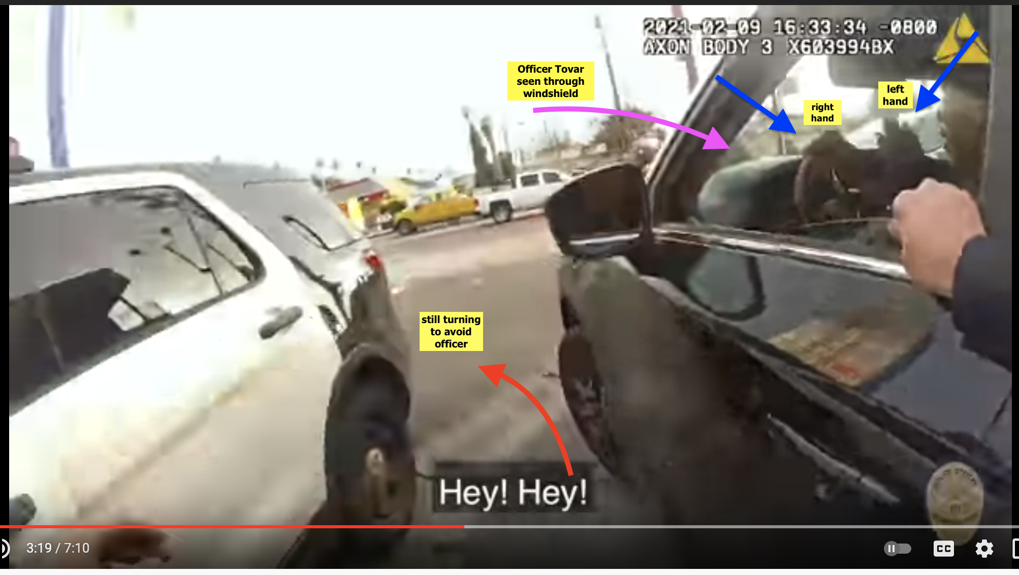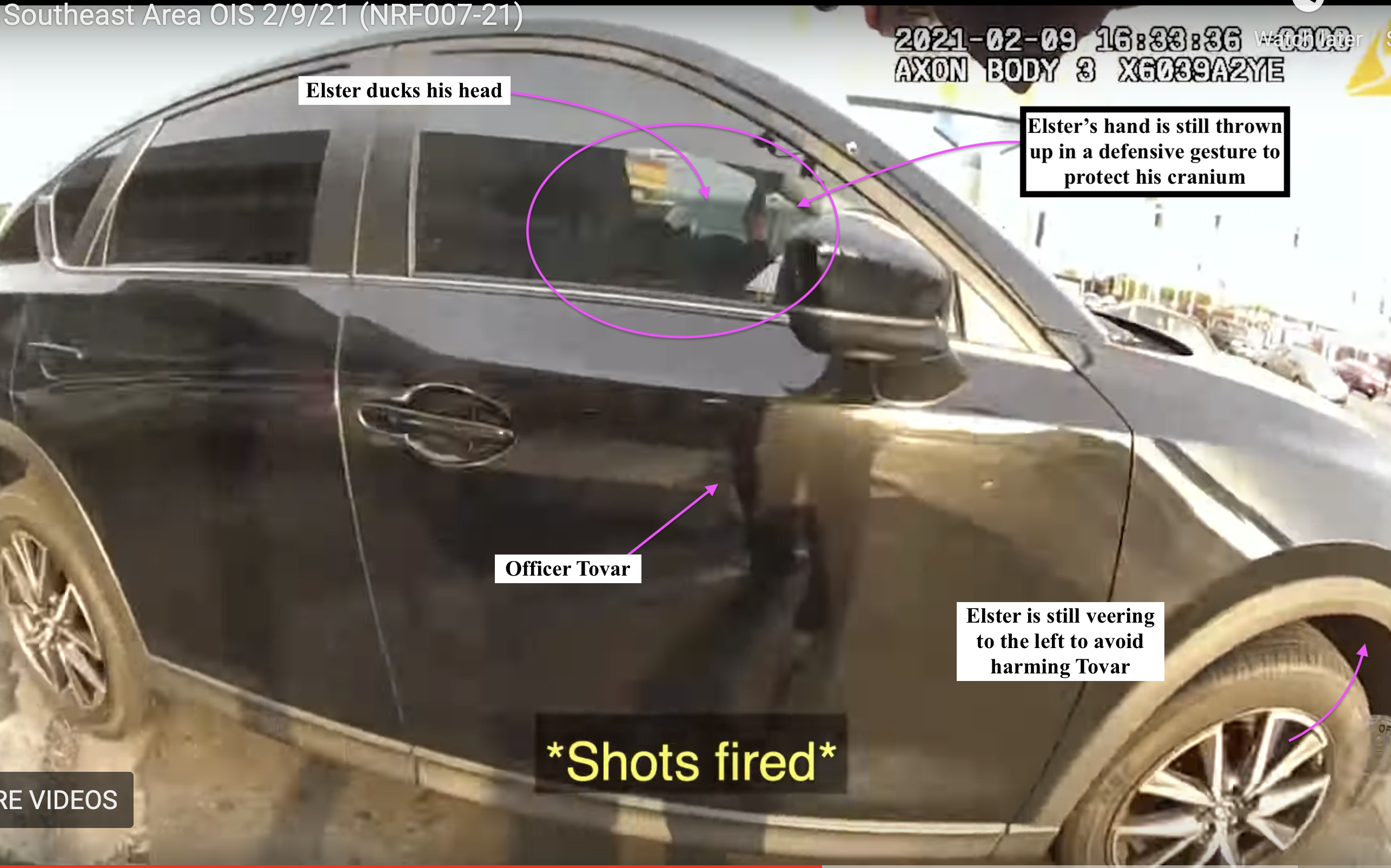 More importantly, it also showed that rather than accelerate toward Tovar, Elster had deliberately maneuvered his vehicle away from the officer, accelerating only after Tovar was out of the way and pulling out his service weapon.