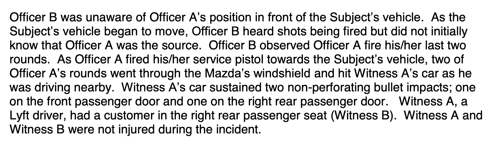 Incredibly, the report offers the first public acknowledgment from LAPD that Tovar (Officer A, below) managed to hit, but thankfully not pierce, the doors of a passing Lyft driver’s vehicle (possibly the taupe vehicle seen above, at left) with two of the last three bullets intended for Elster.