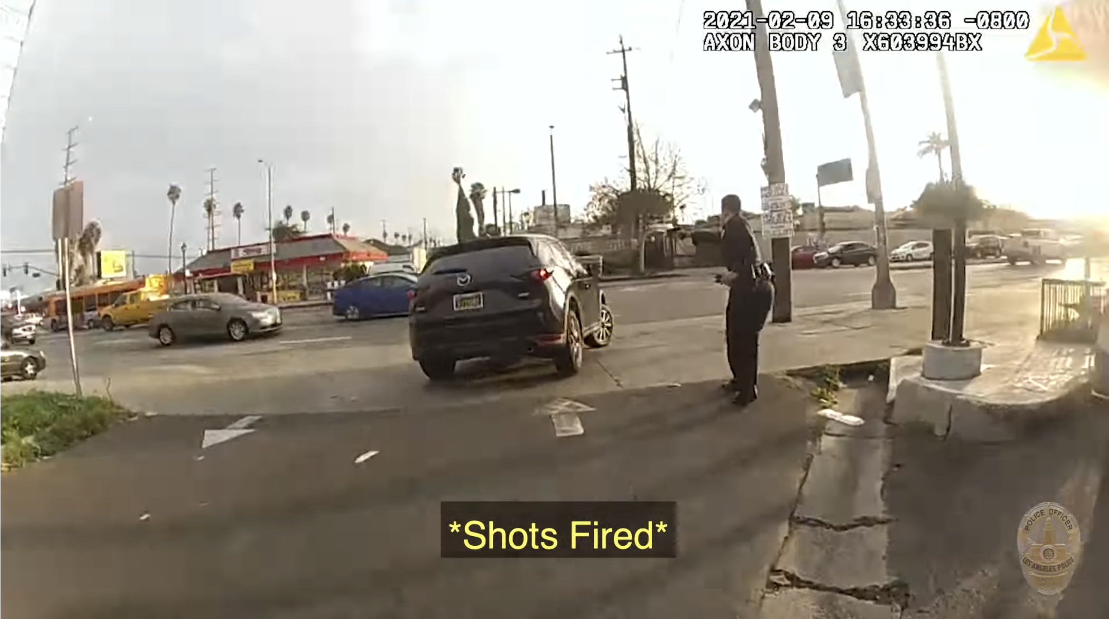 LAPD policy prohibits officers from firing at a moving vehicle.