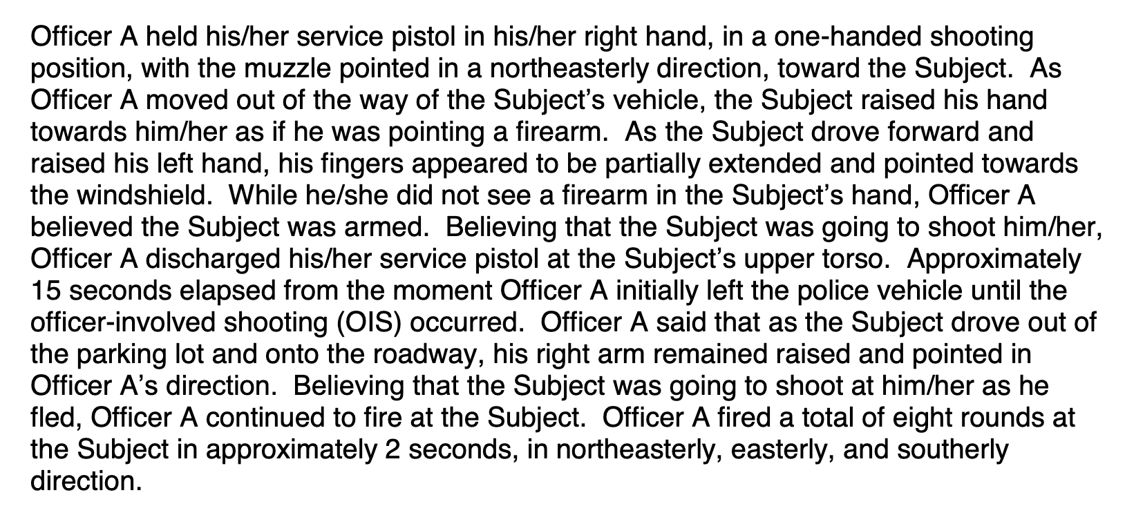 Yet, despite all evidence to the contrary, they ruled that Tovar had not violated the presumptive threat clause of the moving vehicles policy because he had fired “at the threat [he] perceived in the Subject’s actions” – the threatening finger gun – “and not the threat posed by the vehicle itself.”