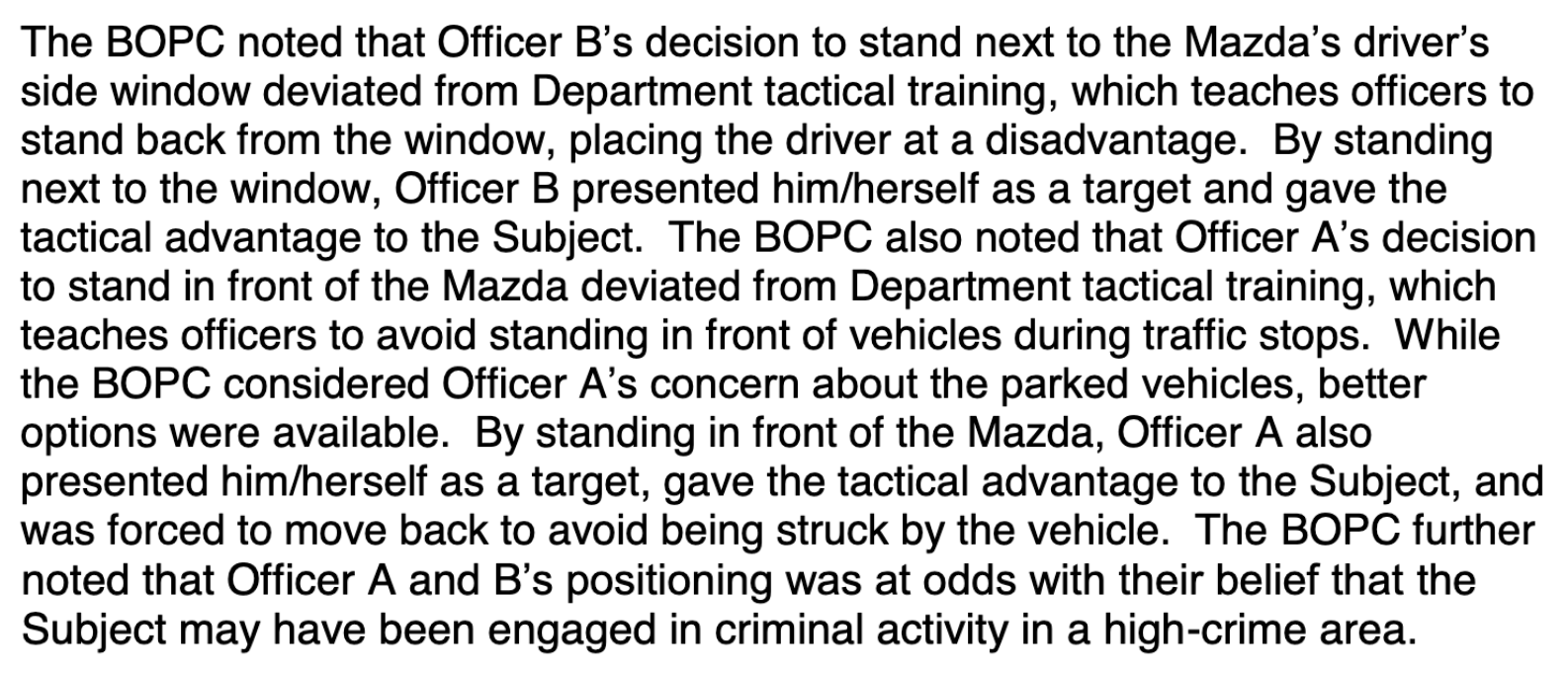 Another surprise in the report was the modest push and pull between LAPD and the Commission. There are multiple points where the BOPC alludes to the significant disconnect between the officers’ claims about the threat they believed Elster posed and the tactical decisions made by the officers.