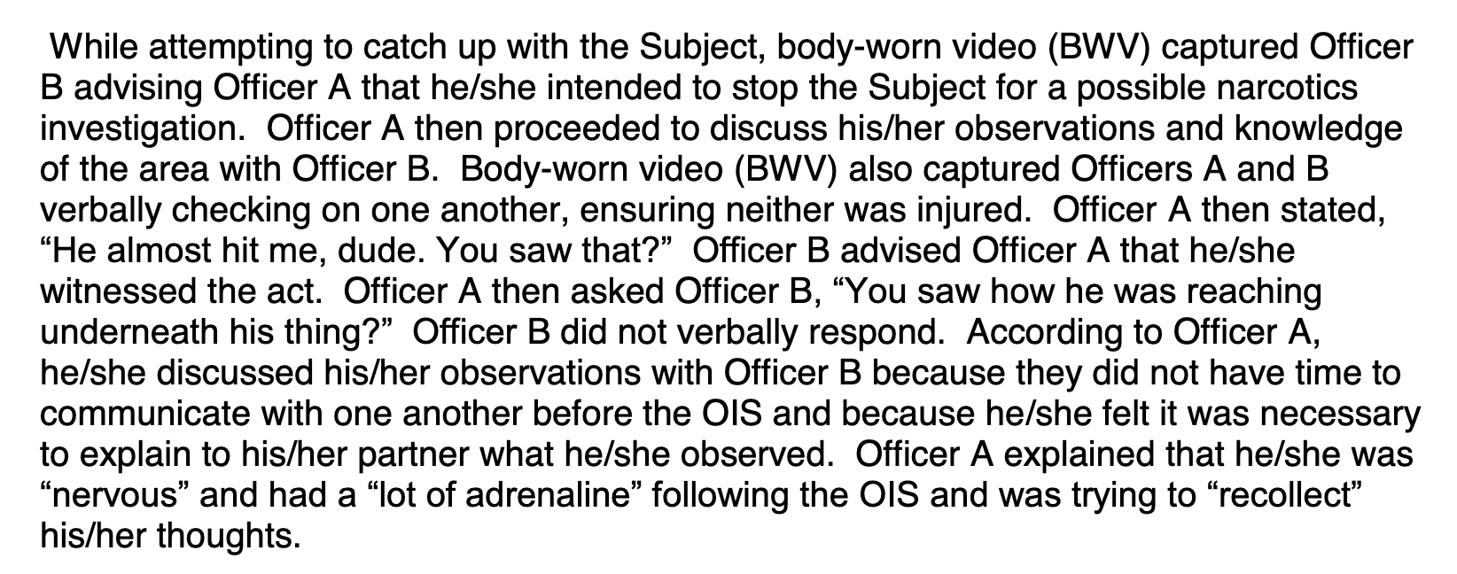 Even within the areas the BOPC is tasked with focusing on in use-of-force cases – officer tactics, the drawing/exhibiting/holstering of weapons, and the use of force – there was room to probe what drove officer decision-making. Instead, shaky justifications for the stop were allowed to stand. Easily falsifiable claims – both by the officers and the department itself – were given the benefit of the doubt. And information about Elster’s record that was “unbeknownst” to the officers at the time was included, likely to bolster claims that Elster was probably engaged in criminal activity and a threat (rather than someone who fled because he was scared his vehicle would be impounded and/or he would end up in jail).