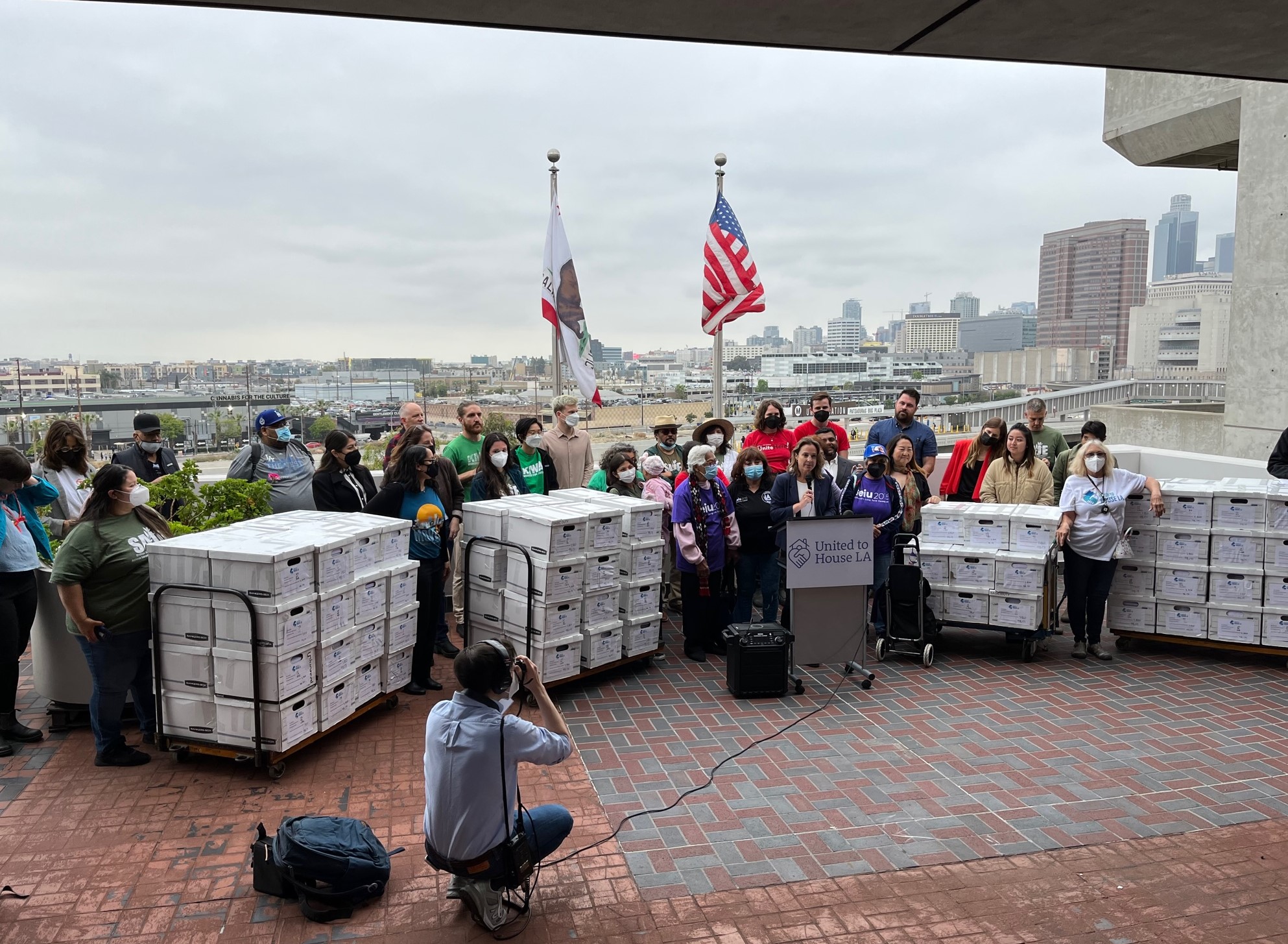 This morning proponents turned in signatures collected to get the United to House L.A. initiative on the November ballot. Before submitting the required signatures to the city of Los Angeles, backers rallied in celebration of today’s milestone. Speakers touted the importance of the initiative’s benefits – from curbing housing costs for working families, to getting unhoused neighbors into housing, to creating good paying jobs.