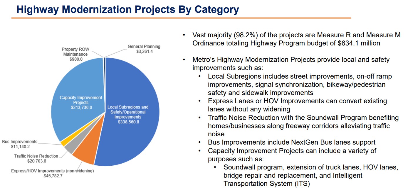 The Highway Modernization Program budget totals $634 million and, in response to many comments received recently, we’d like to share that there are many different project categorizations under this program, such as supporting local and safety improvements. The largest portion consists of local subregional projects for things like street improvements, on/off ramp improvements, signal synchronization, and bikeway pedestrian and sideway sidewalk improvements. There are also ExpressLanes and HOV improvements, which is conversion of existing lanes. There are also traffic noise reduction projects, with the highway soundwall program benefiting home and businesses along freeway corridors, NextGen Bus Lanes as well for improving bus transit services. […] Lastly, there are capacity improvement projects, which the scope can include a variety of purposes including soundwalls, extension of truck lanes, bridge repair and replacement, and technology system enhancements.
