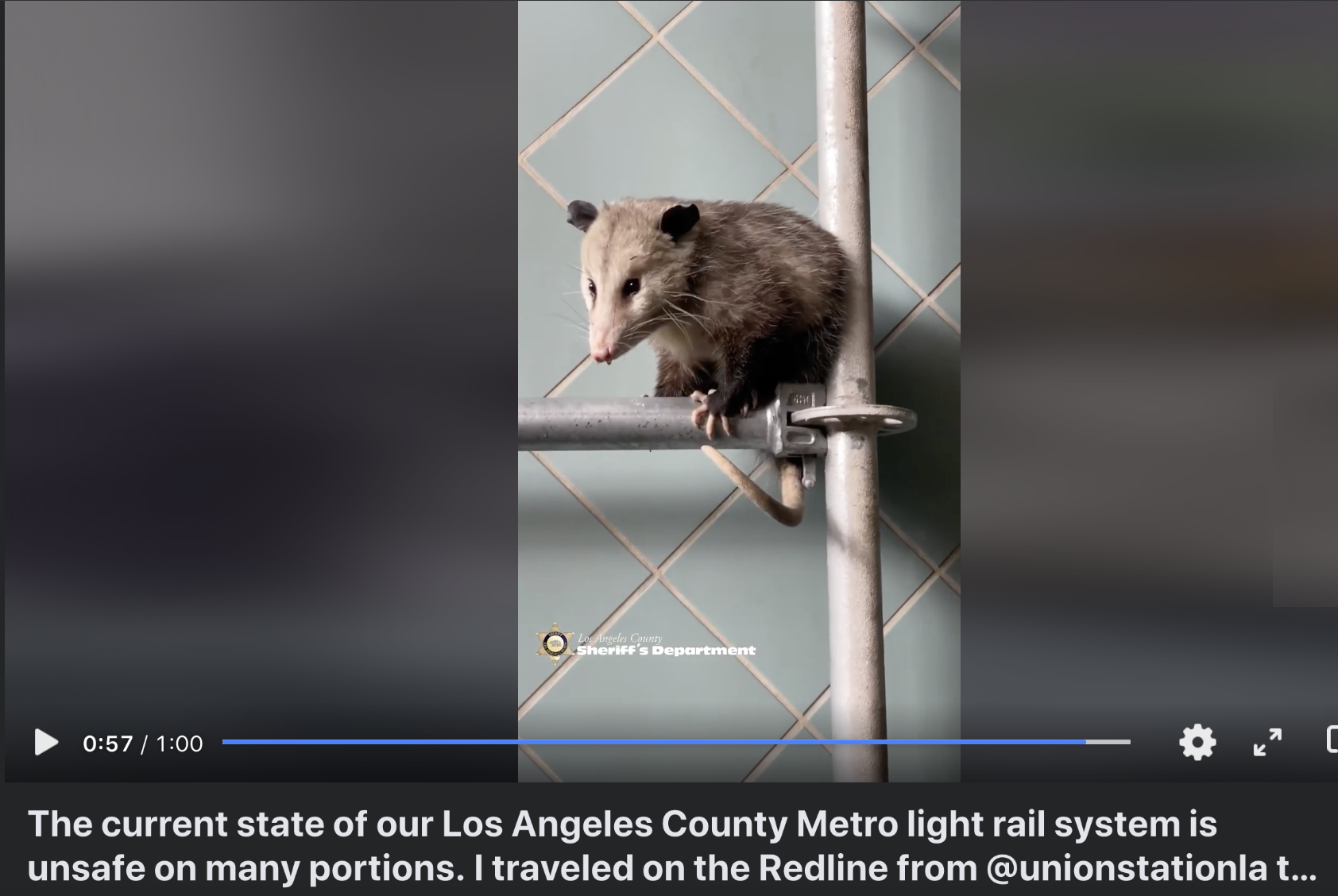 Case in point, the most memorable part of the video of his recent trek to Hollywood on the Red Line – a trip intended to showcase the “mayhem” Villanueva claims Metro has unleashed but instead featured him dramatically intoning, “Why did I have to see the mentally ill and the drug addicted sprawl out over the benches on the trains?” – was a wee possum on a pole.