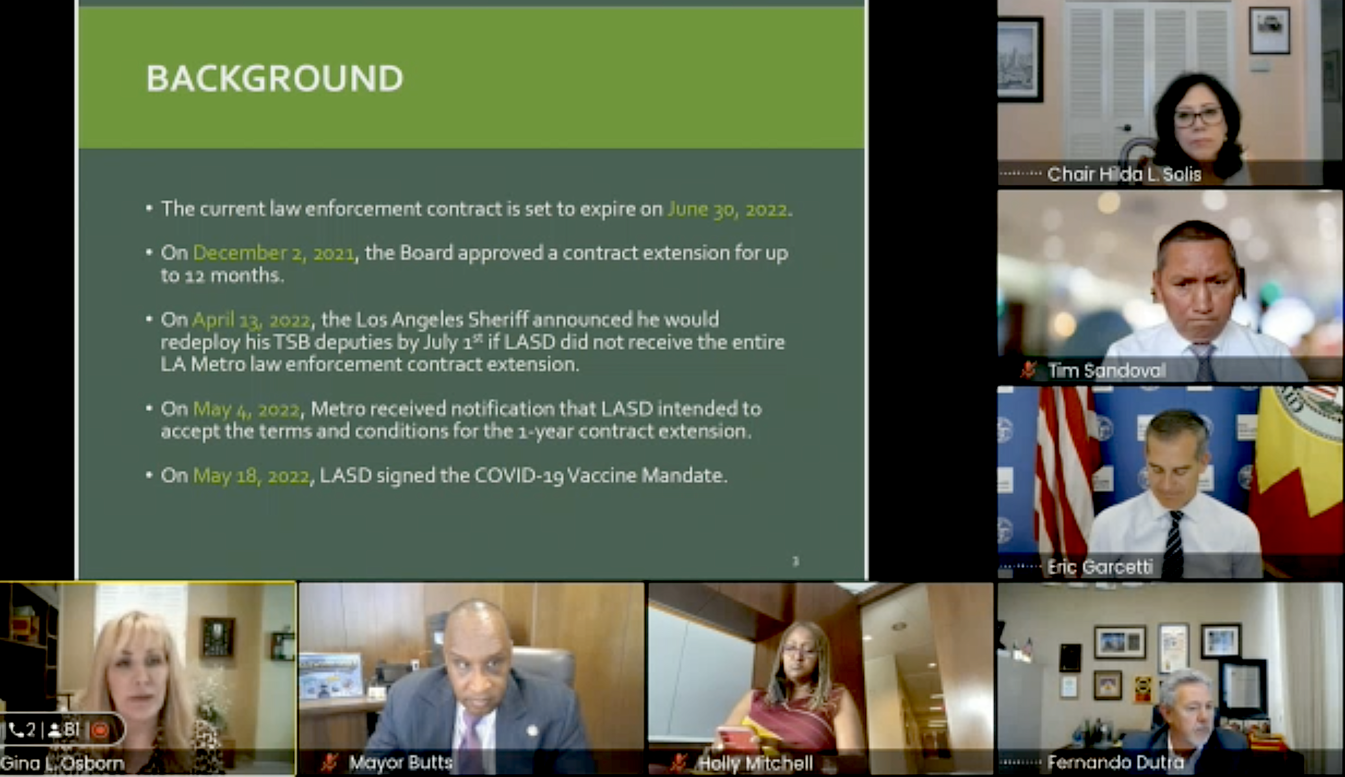 Boardmembers subsequently moved to set up a contingency plan to ensure the system would be covered if needed. At the May 26 board meeting, Chief Security Officer Gina Osborn sounded pleased to report LAPD had been more than ready to meet and exceed the contract expectations of the sheriffs. A staff report also notes that more than 25 police chiefs from around the county met with Metro to learn more about the sudden potential contract opportunity.