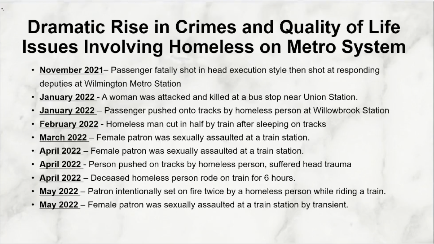 Kehoe then referenced the powerpoint slide Villanueva had shown earlier (below) and said that the crimes listed there had been perpetrated by homeless people. That list of ten events includes the “crimes” of expiring on the system and of being hit by a train after falling asleep on the tracks.