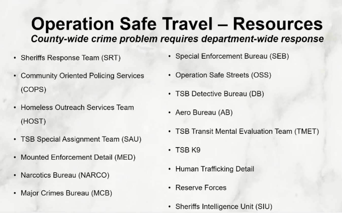 At that similarly grievance-fueled briefing, Villanueva had railed that Metro was “degrading the capacity of law enforcement to address crime in a proactive manner” by having shifted responsibility for most code of conduct enforcement to Metro’s Transit Security Guards (TSOs). Then he had declared that if the sheriff’s department was not reinstated as the sole agency responsible for policing the full Metro system – including code of conduct violations – as of July 1, he would reassign his deputies to other areas, effectively abandoning Metro.