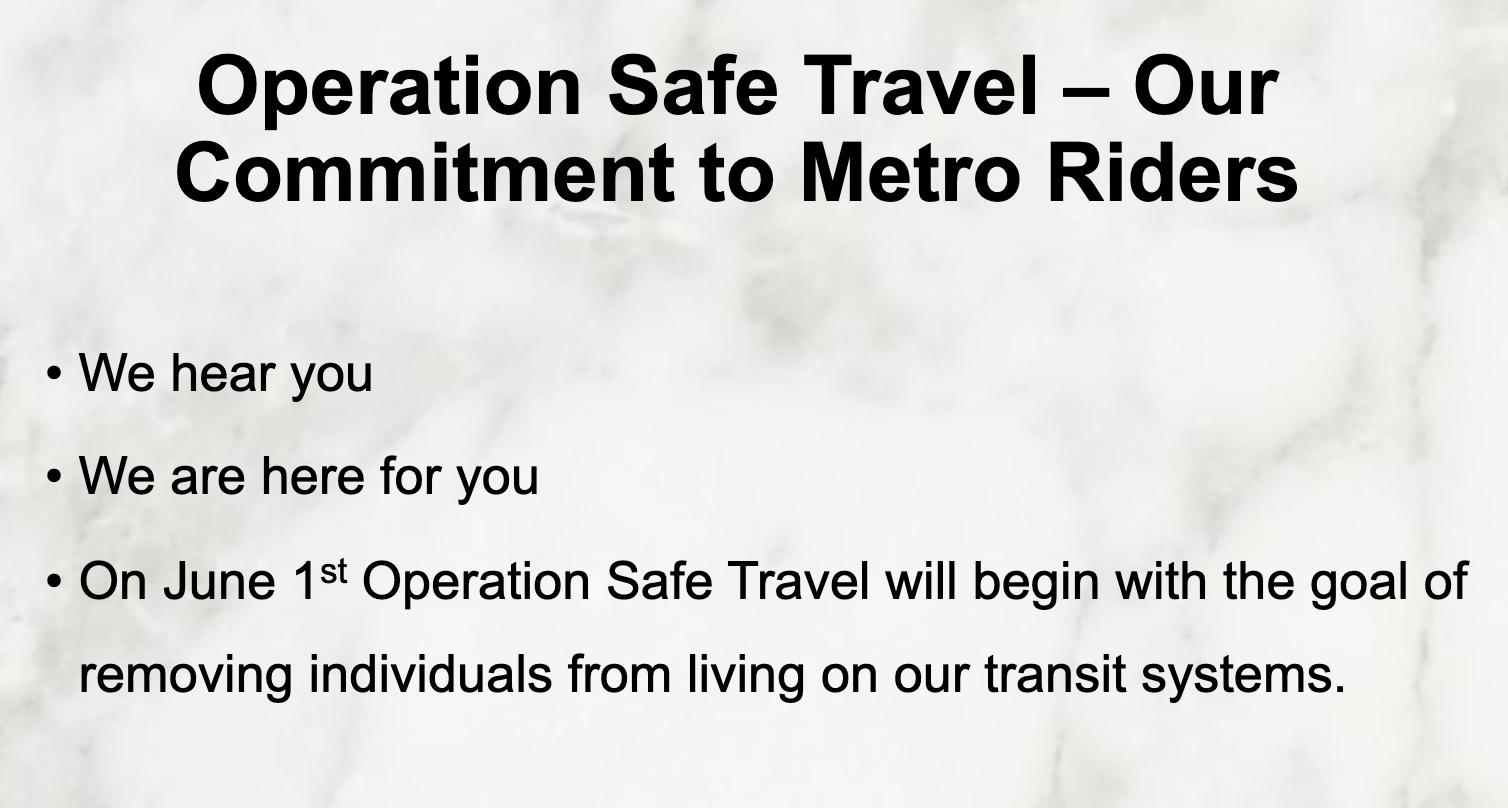 To expel every last one of the approximately 5,700 unhoused people estimated to be riding and/or taking shelter on Metro from the system starting on June 1.