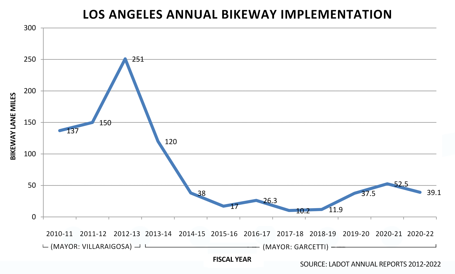 Under Mayor Antonio Villaraigosa, bike facility implementation peaked at 200+ new bikeway lane-miles annually. Since Mayor Eric Garcetti took office in 2013, implementation has fallen dramatically. Under Garcetti-appointed city Transportation Department (LADOT) General Manager Seleta Reynolds, new bikeway mileage has been dismal, hovering between 10 and 52 miles annually for the past seven years.
