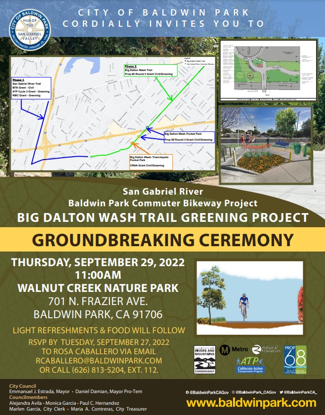 • Thursday 9/29 – The city of Baldwin Park will host a groundbreaking ceremony for its Big Dalton Wash Trail Greening Project. Festivities take place starting at 11 a.m. at Walnut Creek Nature Park at 701 N. Frazier Avenue. RSVP to Rosa Caballero via rcaballero@baldwinpark.com or call (626)813-5204, extension 112. Details at event flier.