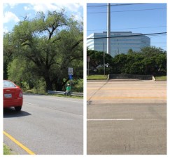 Would you rather wait behind a guard rail on a highway embankment, or on a skinny sidewalk in front of a muffler shop? Vote here.